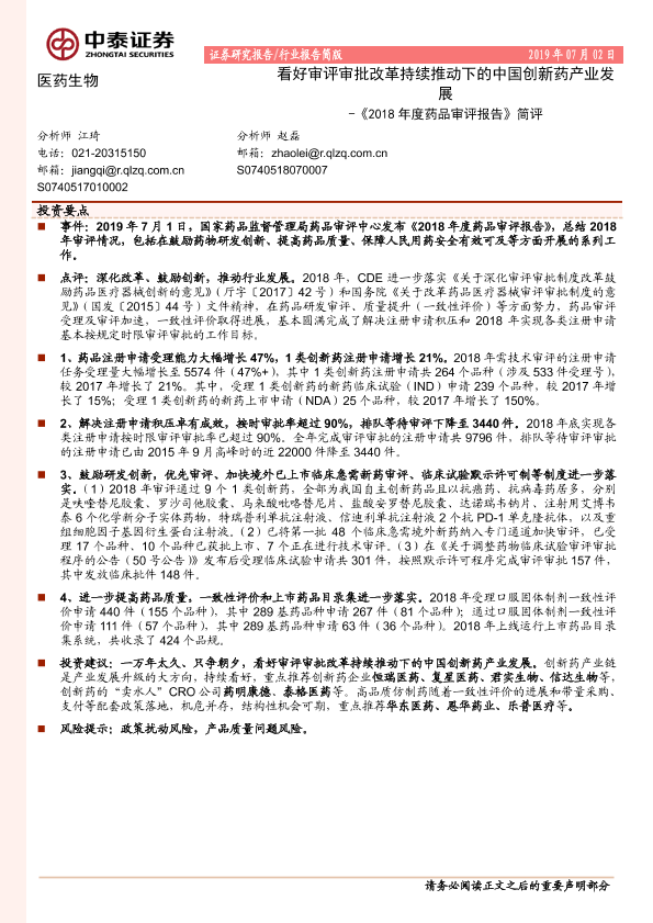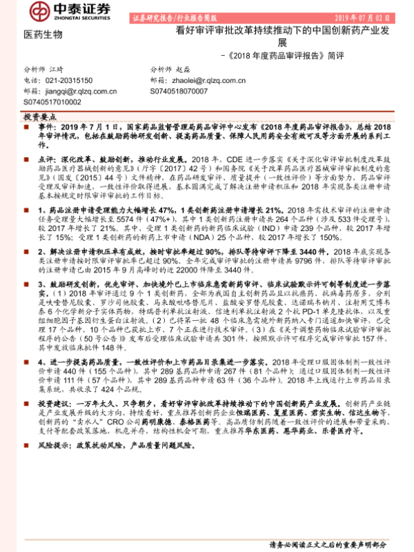【中泰证券】【20190702】2018年度药品审评报告简评:看好审评审批改革持续推动下的中国创新药产业发展-3页