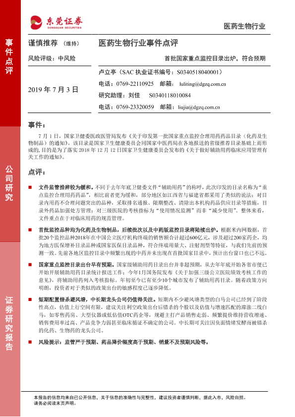 【东莞证券】【20190703】医药生物行业事件点评:首批国家重点监控目录出炉,符合预期-3页