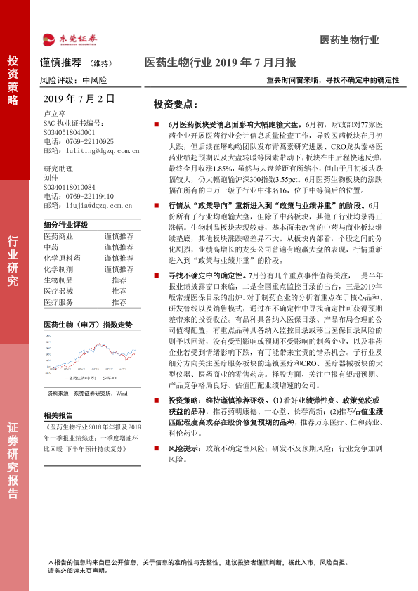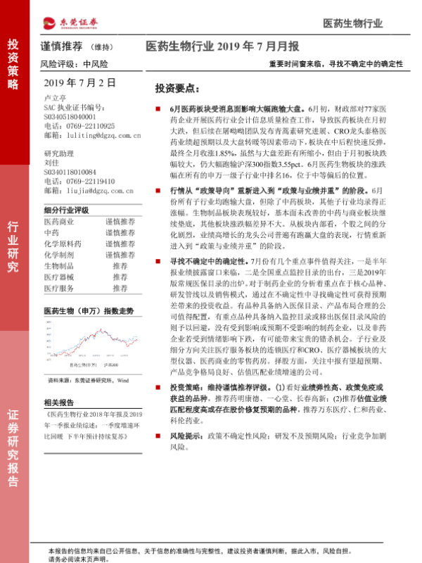 【东莞证券】【20190702】医药生物行业2019年7月月报:重要时间窗来临,寻找不确定中的确定性-15页