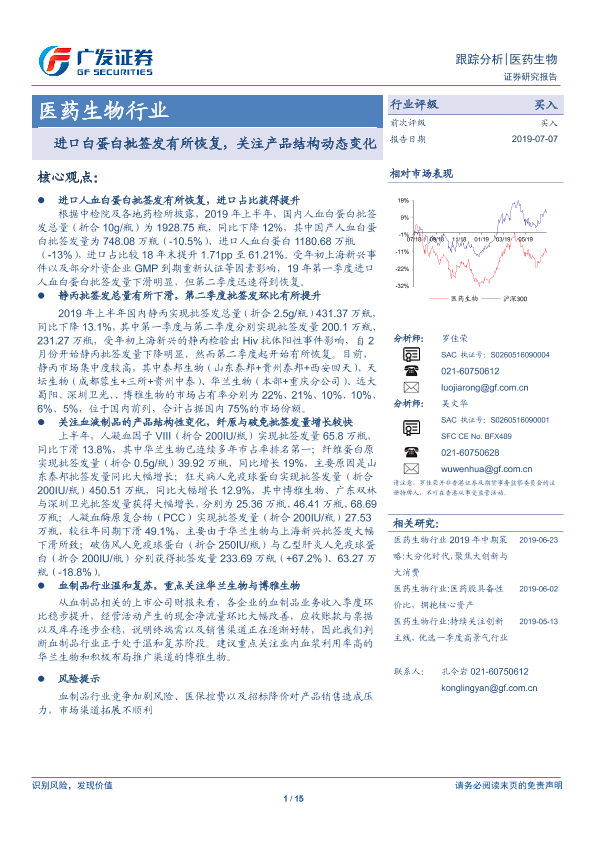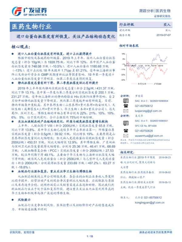 【广发证券】【20190707】医药生物行业:进口白蛋白批签发有所恢复,关注产品结构动态变化-15页