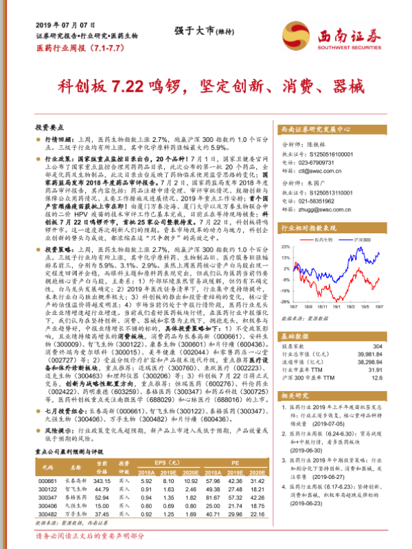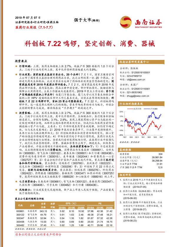 【西南证券】【20190707】医药行业周报:科创板7.22鸣锣,坚定创新、消费、器械-13页