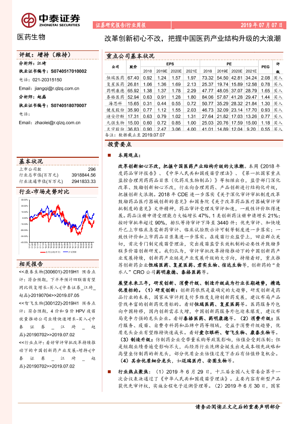 【中泰证券】【20190707】医药生物行业周报:改革创新初心不改,把握中国医药产业结构升级的大浪潮-8页