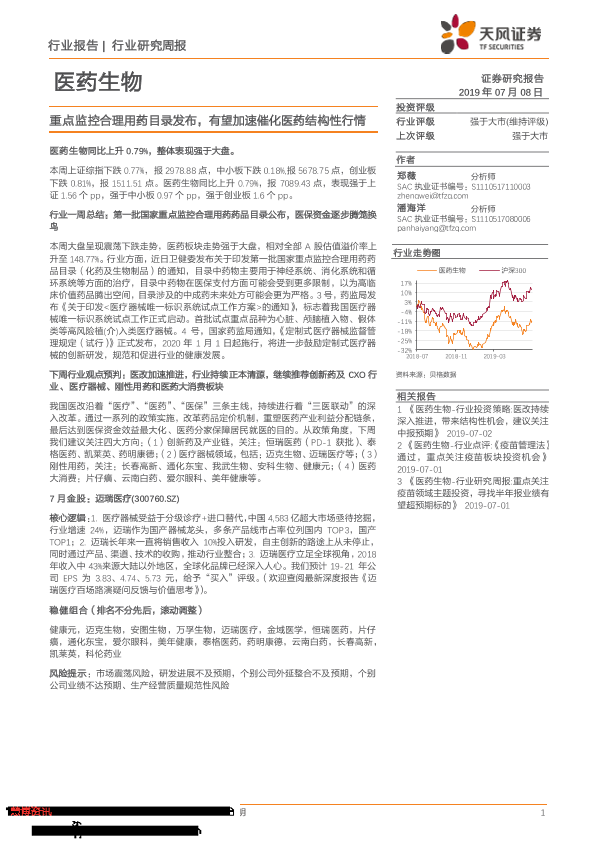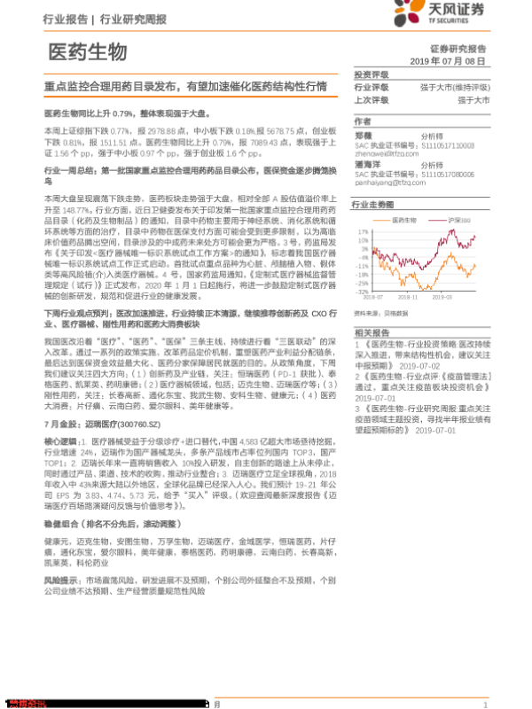 【天风证券】【20190708】医药生物行业研究周报:重点监控合理用药目录发布,有望加速催化医药结构性行情-13页
