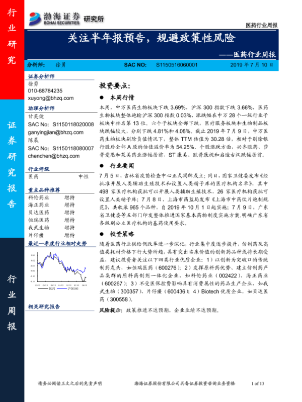 【渤海证券】【20190710】医药行业周报:关注半年报预告,规避政策性风险-13页