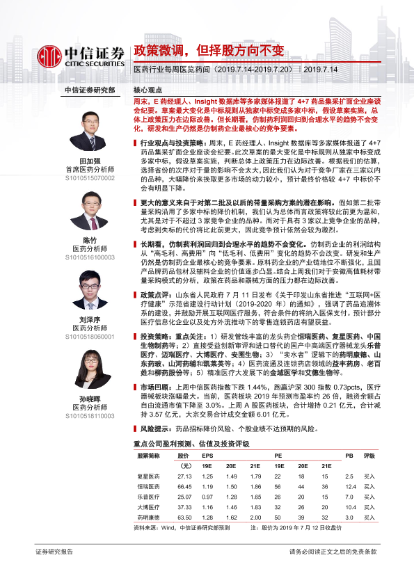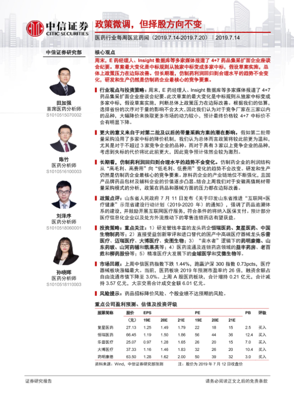【中信证券】【20190714】医药行业每周医览药闻:政策微调,但择股方向不变-14页