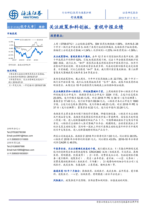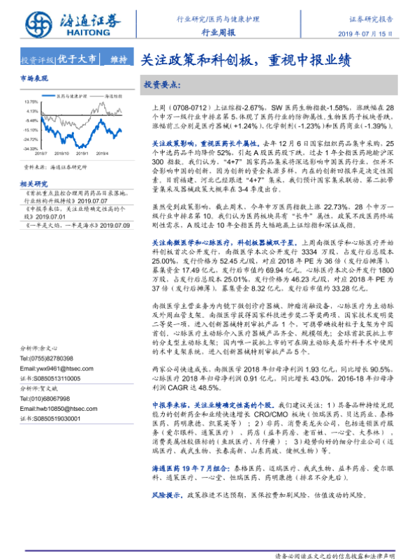 【海通证券】【20190715】医药与健康护理行业周报:关注政策和科创板,重视中报业绩-9页