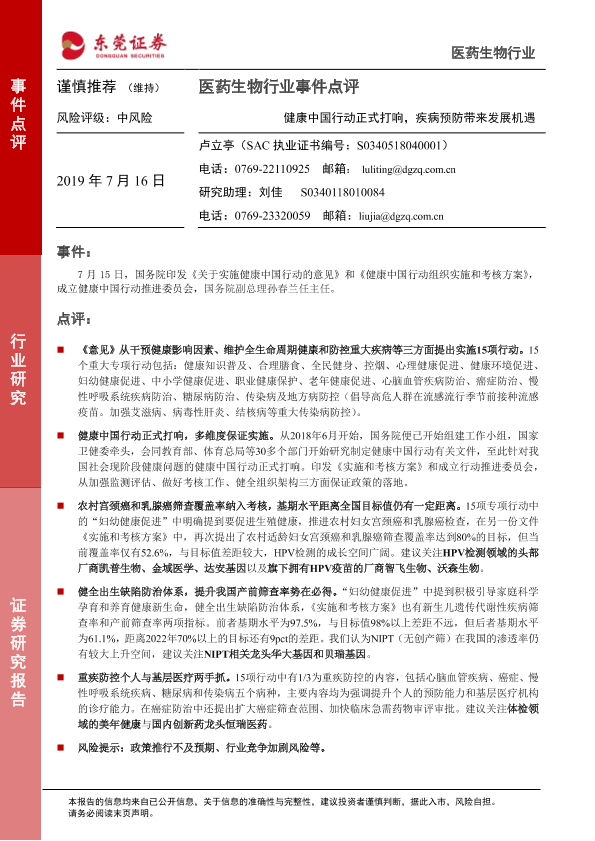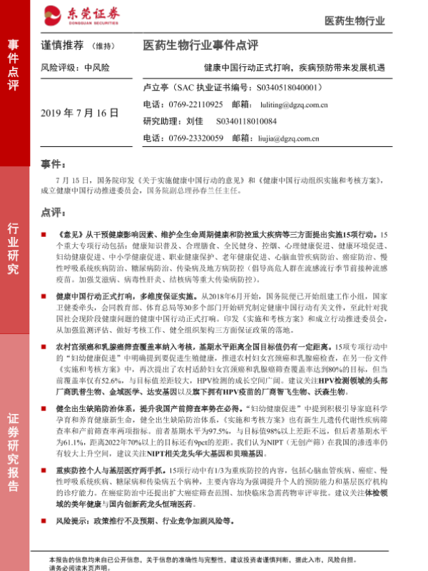 【东莞证券】【20190716】医药生物行业事件点评:健康中国行动正式打响,疾病预防带来发展机遇-2页