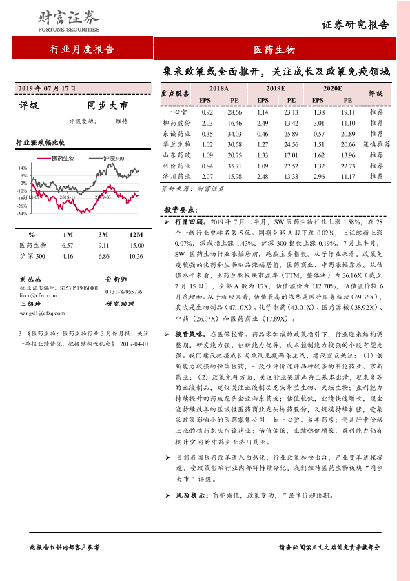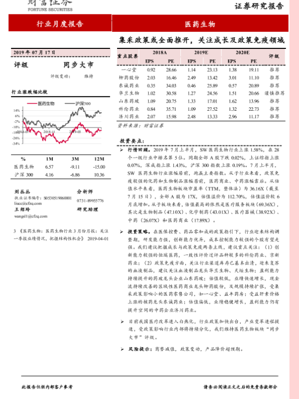 【财信证券】【20190717】医药生物行业月度报告:集采政策或全面推开,关注成长及政策免疫领域-9页