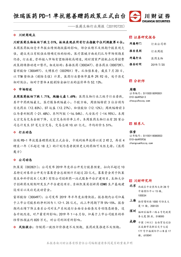 【川财证券】【20190720】医药生物行业周报:恒瑞医药PD-1单抗慈善赠药政策正式出台-13页