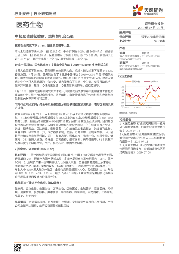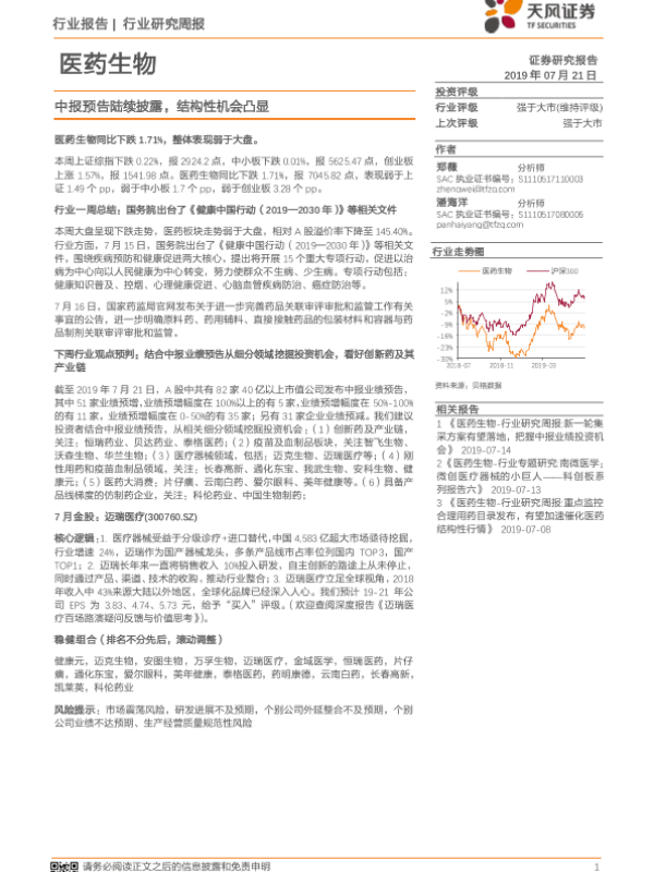 【天风证券】【20190721】医药生物行业研究周报:中报预告陆续披露,结构性机会凸显-19页