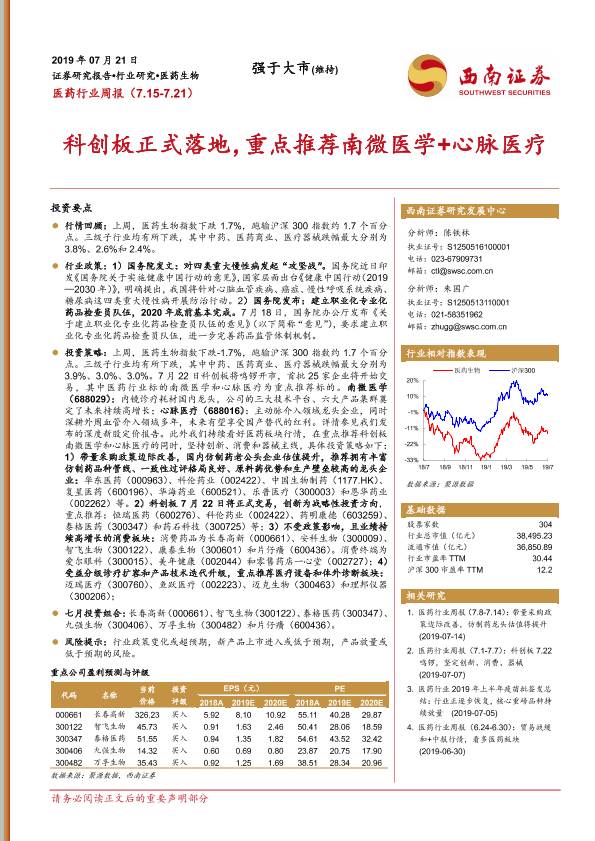 【西南证券】【20190721】医药行业周报:科创板正式落地,重点推荐南微医学+心脉医疗-13页