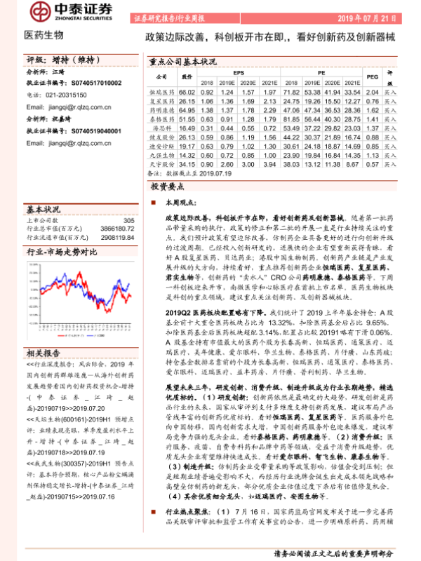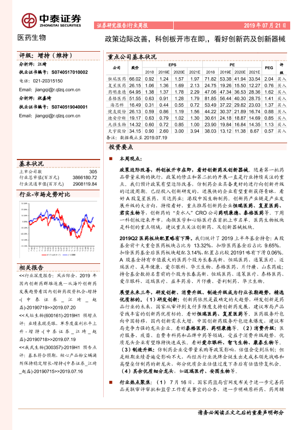 【中泰证券】【20190721】医药生物行业周报:政策边际改善,科创板开市在即,看好创新药及创新器械-9页