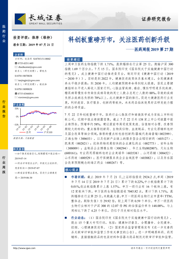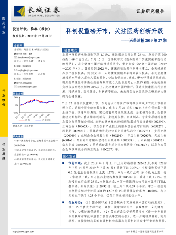 【长城证券】【20190721】医药周报2019第27期:科创板重磅开市,关注医药创新升级-20页