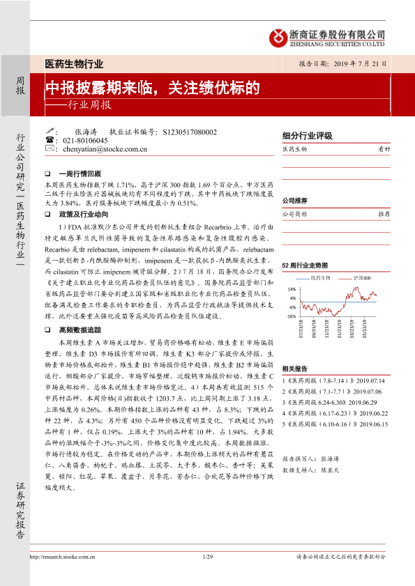 【浙商证券】【20190721】医药生物行业周报:中报披露期来临,关注绩优标的-29页