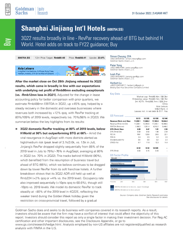 【Goldman Sachs】【20221031】Shanghai Jinjiang Int'l Hotels(600754.SS) 3Q22 results broadly in line- RevPar recovery ahead of BTG but behind H World-10页