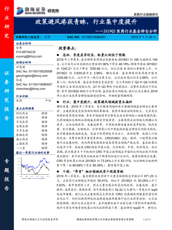 【渤海证券】【20190725】2019Q2医药行业基金持仓分析:政策避风港获青睐,行业集中度提升-15页