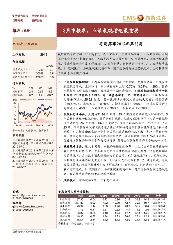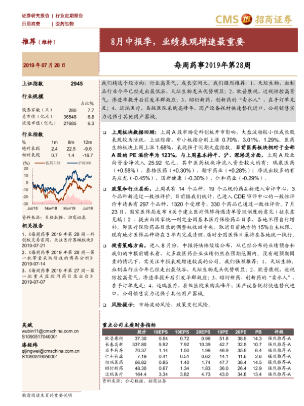 【海通证券】【20190728】每周药事2019年第28周:8月中报季,业绩表观增速最重要-3页