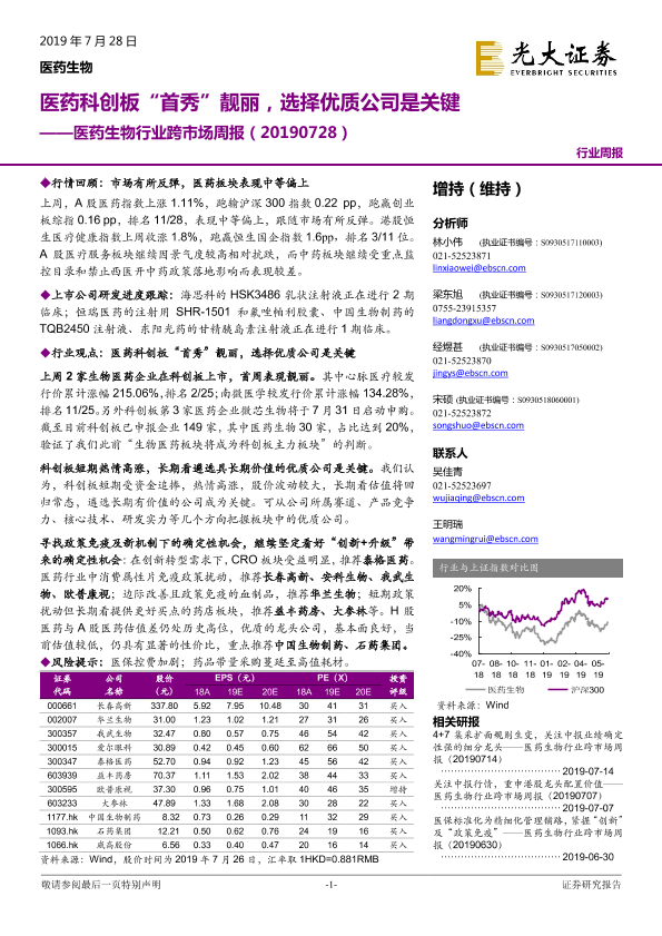 【光大证券】【20190728】医药生物行业跨市场周报:医药科创板“首秀”靓丽,选择优质公司是关键-35页