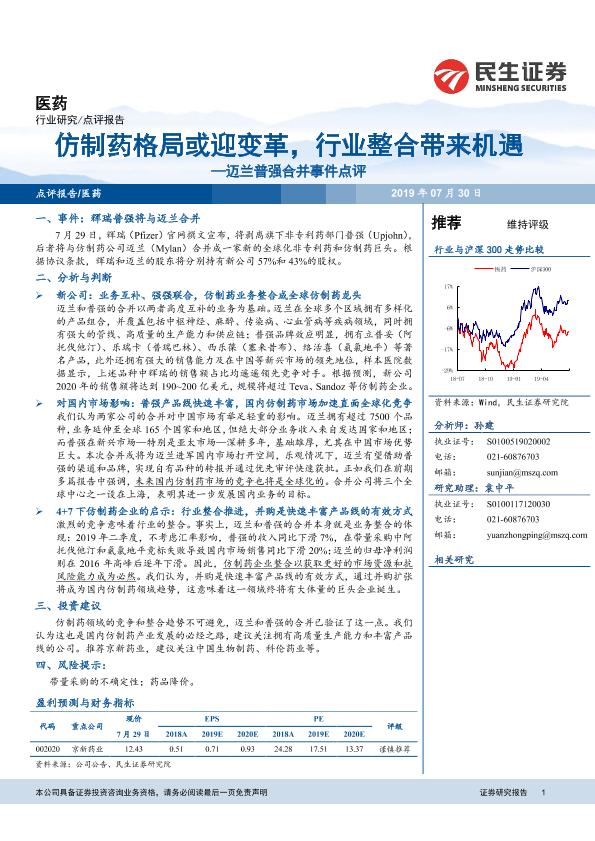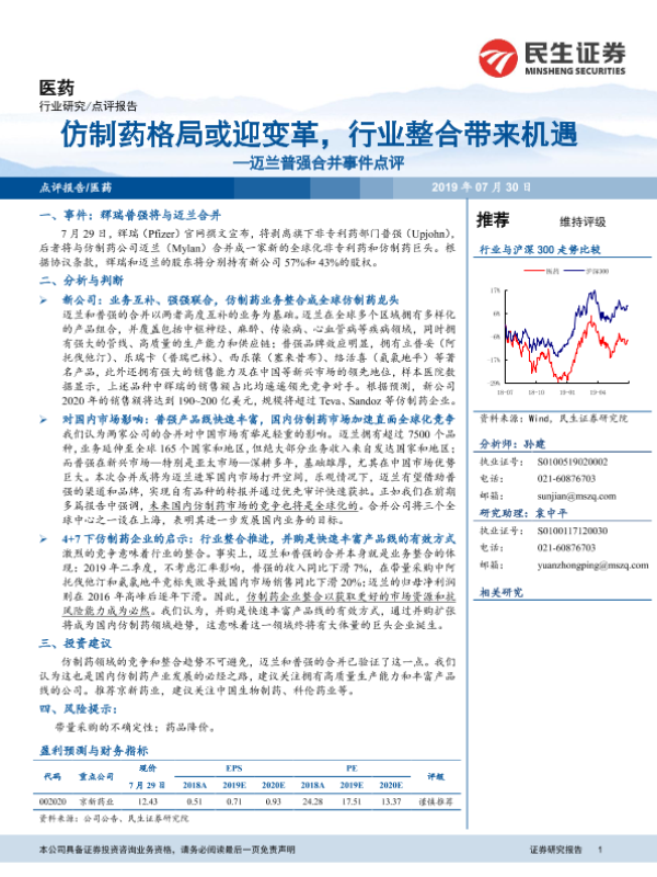 【民生证券】【20190730】迈兰普强合并事件点评-仿制药格局或迎变革,行业整合带来机遇-4页
