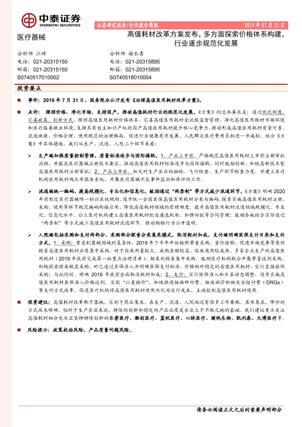 【中泰证券】【20190731】高值耗材改革方案发布,多方面探索价格体系构建,行业逐步规范化发展-2页
