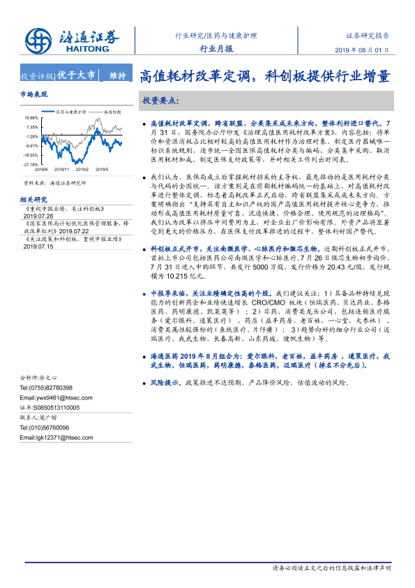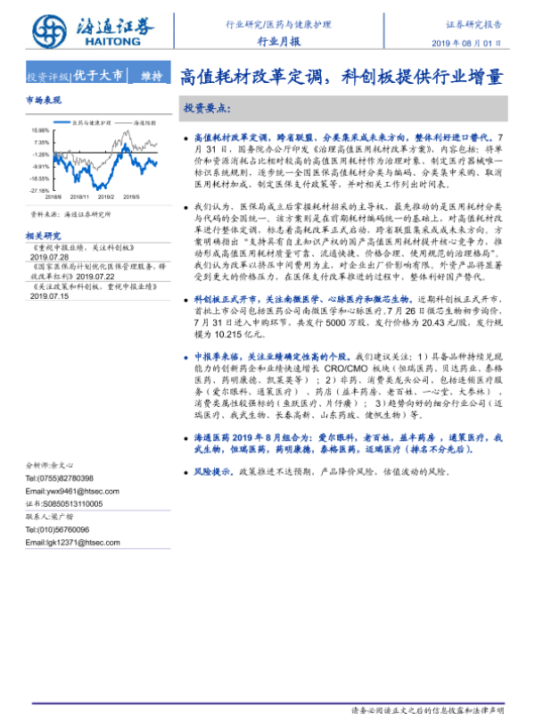 【海通证券】【20190801】医药与健康护理行业月报:高值耗材改革定调,科创板提供行业增量-12页