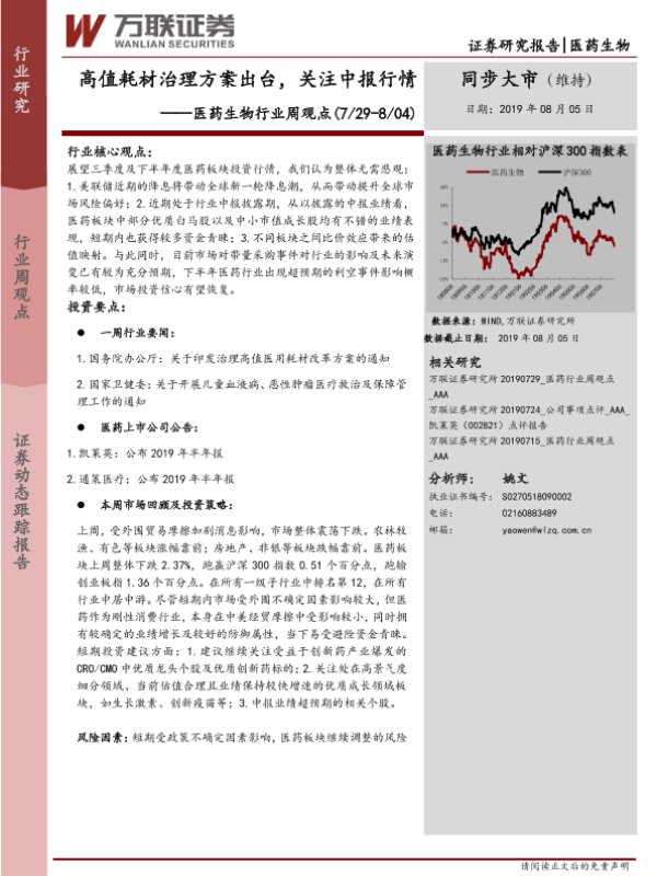 【万联证券】【20190805】医药生物行业周观点:高值耗材治理方案出台,关注中报行情-10页