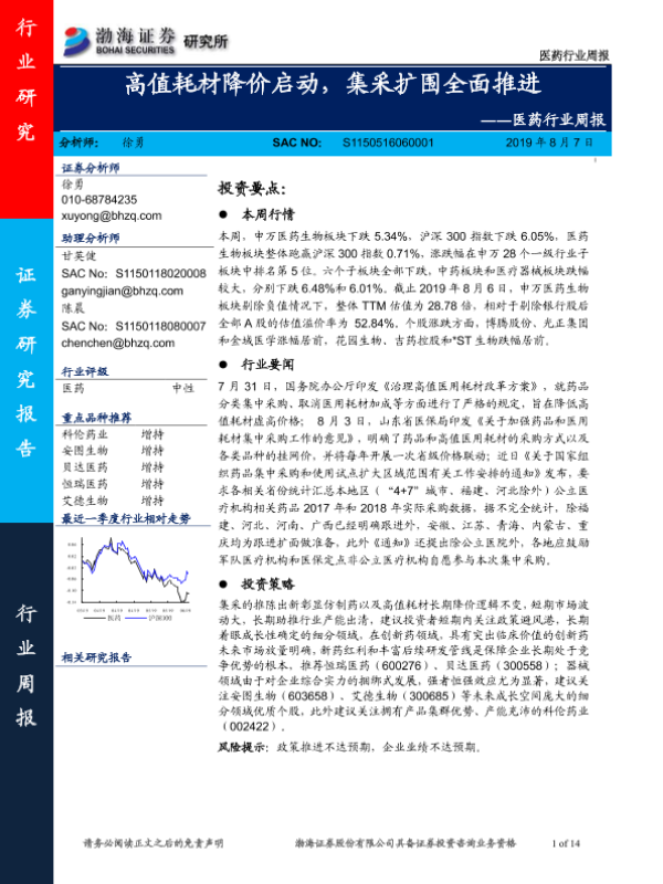 【渤海证券】【20190807】医药行业周报:高值耗材降价启动,集采扩围全面推进-14页