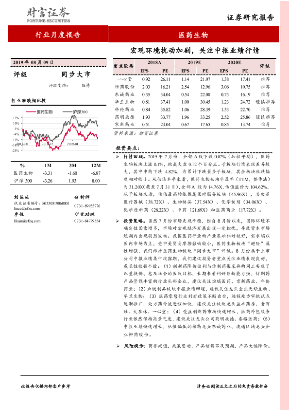 【财信证券】【20190809】医药生物行业月度报告:宏观环境扰动加剧,关注中报业绩行情-10页