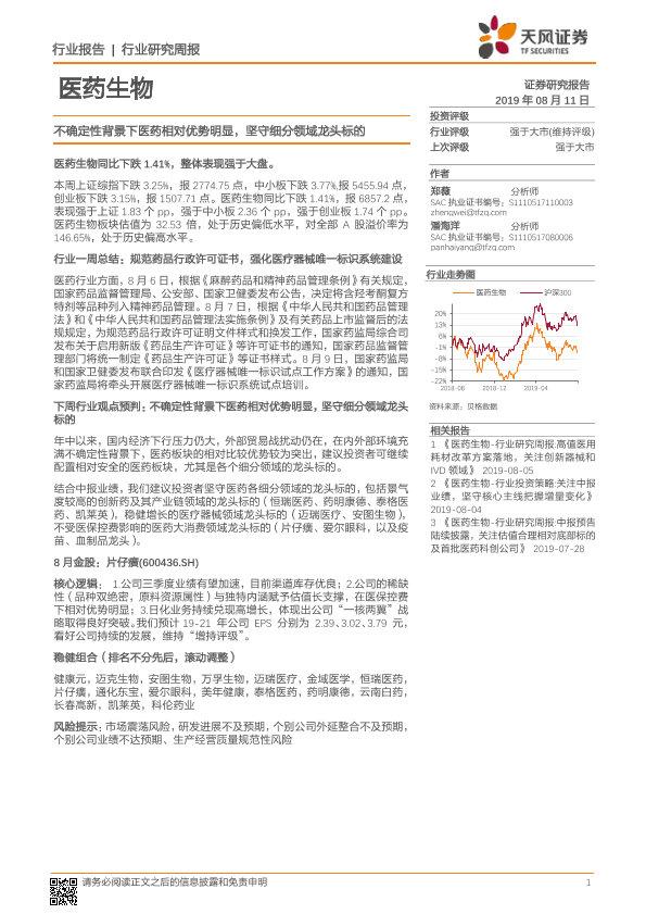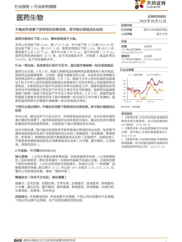 【天风证券】【20190811】医药生物行业研究周报:不确定性背景下医药相对优势明显,坚守细分领域龙头标的-10页