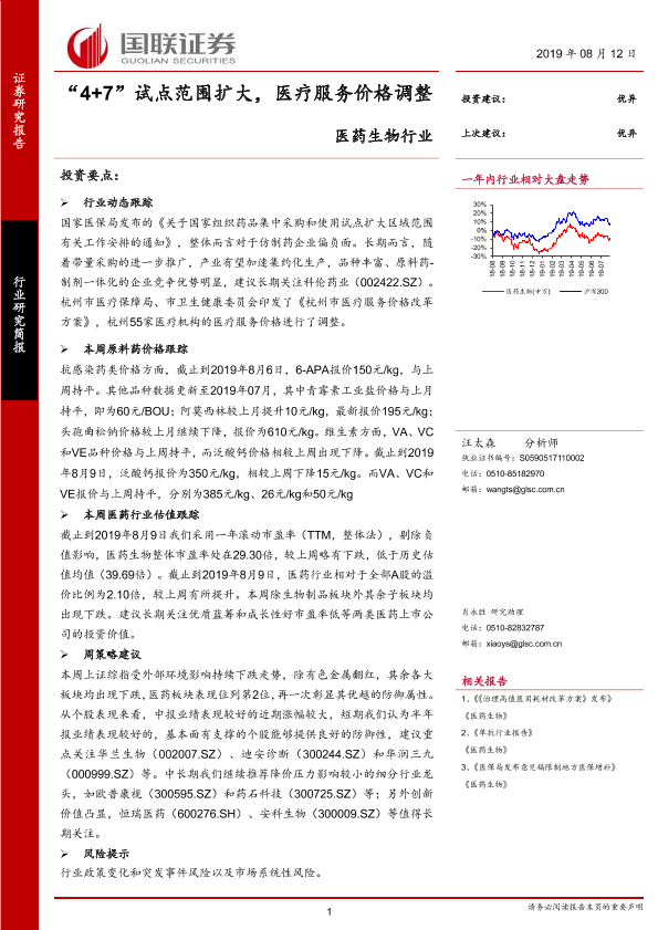 【国联证券】【20190812】医药生物行业:“4+7”试点范围扩大,医疗服务价格调整-17页