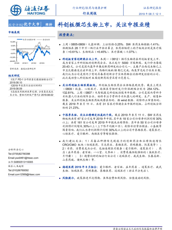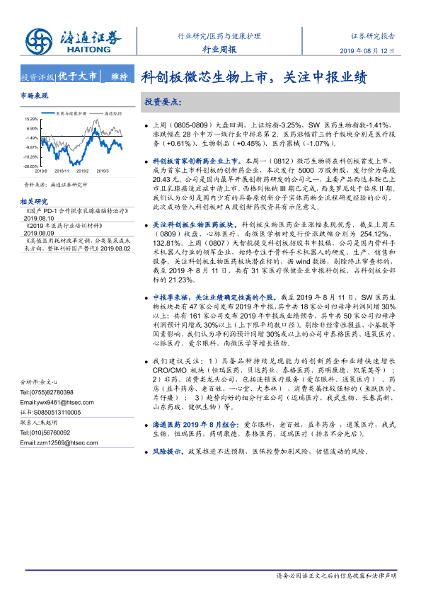 【海通证券】【20190812】医药与健康护理行业周报:科创板微芯生物上市,关注中报业绩-9页