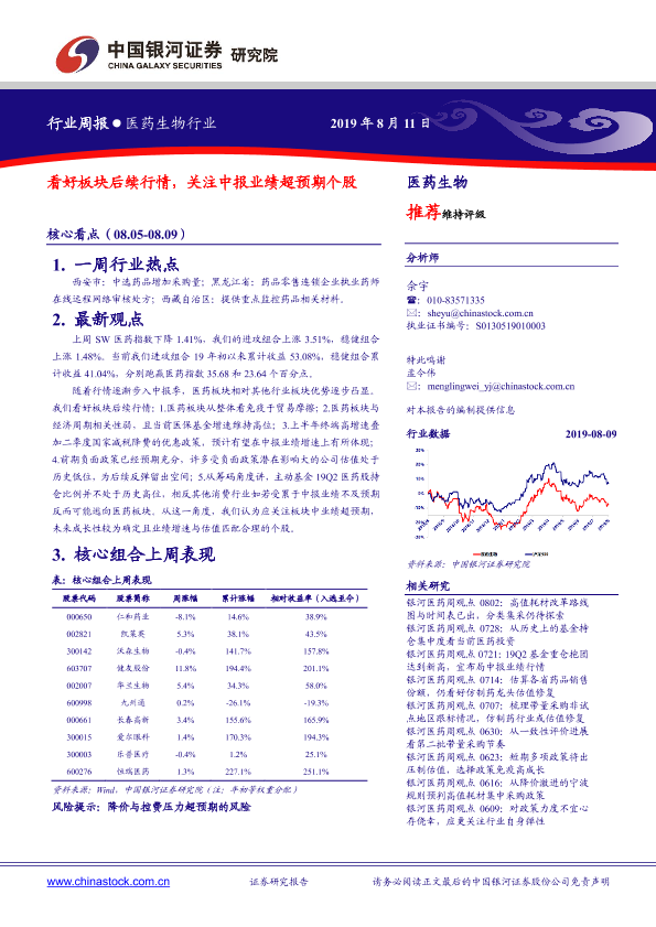【银河证券】【20190811】医药生物行业周报:看好板块后续行情,关注中报业绩超预期个股-27页