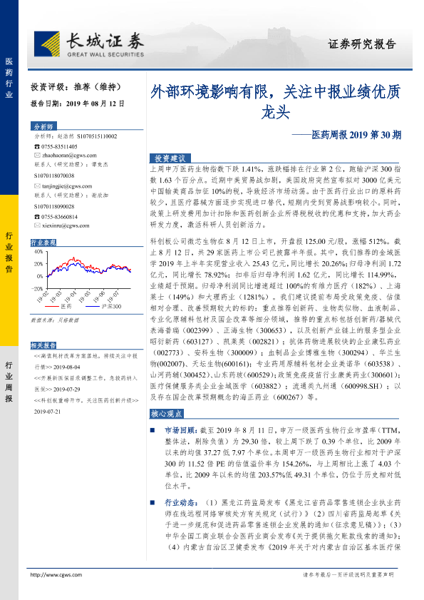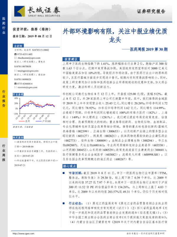 【长城证券】【20190812】医药周报2019第30期:外部环境影响有限,关注中报业绩优质龙头-16页