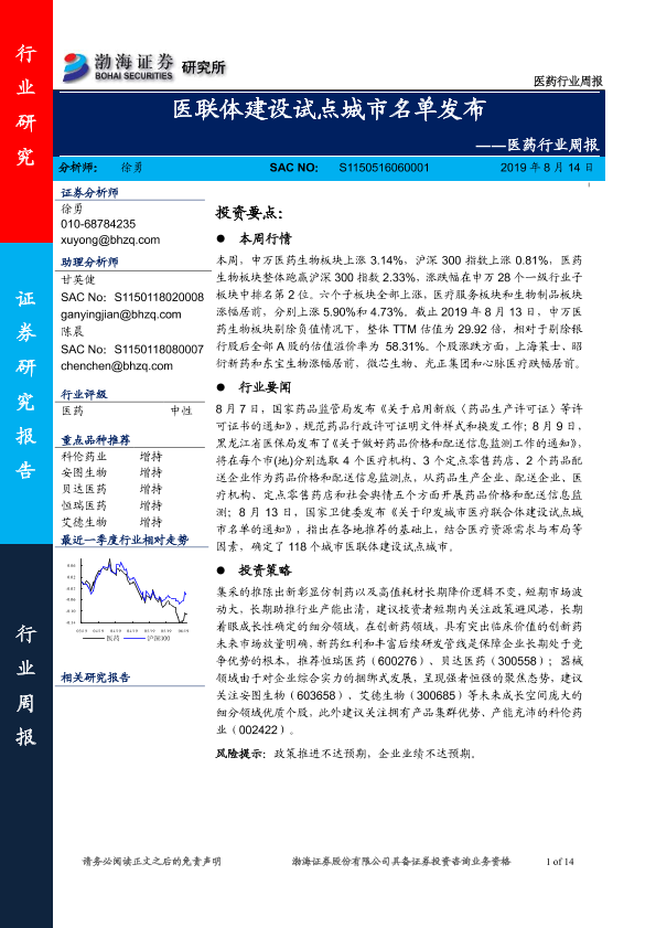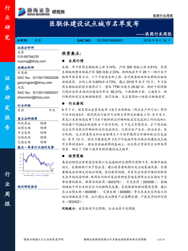 【渤海证券】【20190814】医药行业周报:医联体建设试点城市名单发布-14页