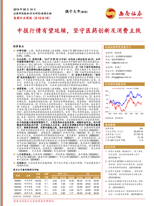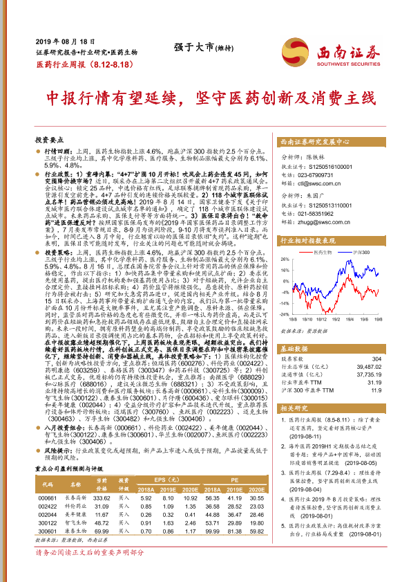 【西南证券】【20190818】医药行业周报:中报行情有望延续,坚守医药创新及消费主线-13页
