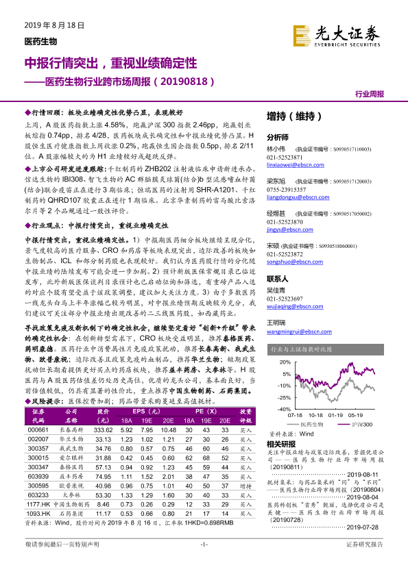 【光大证券】【20190818】医药生物行业跨市场周报:中报行情突出,重视业绩确定性-31页