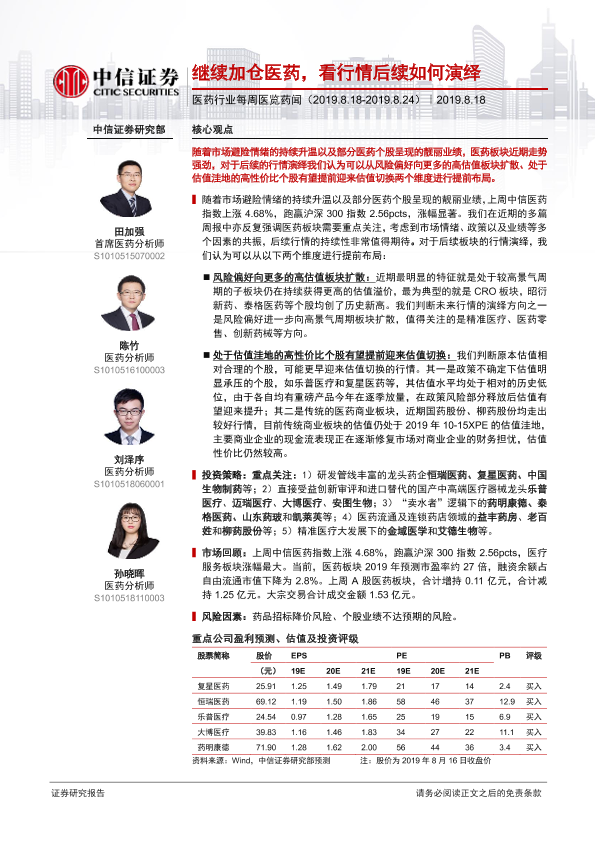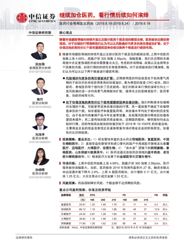 【中信证券】【20190818】医药行业每周医览药闻:继续加仓医药,看行情后续如何演绎-20页