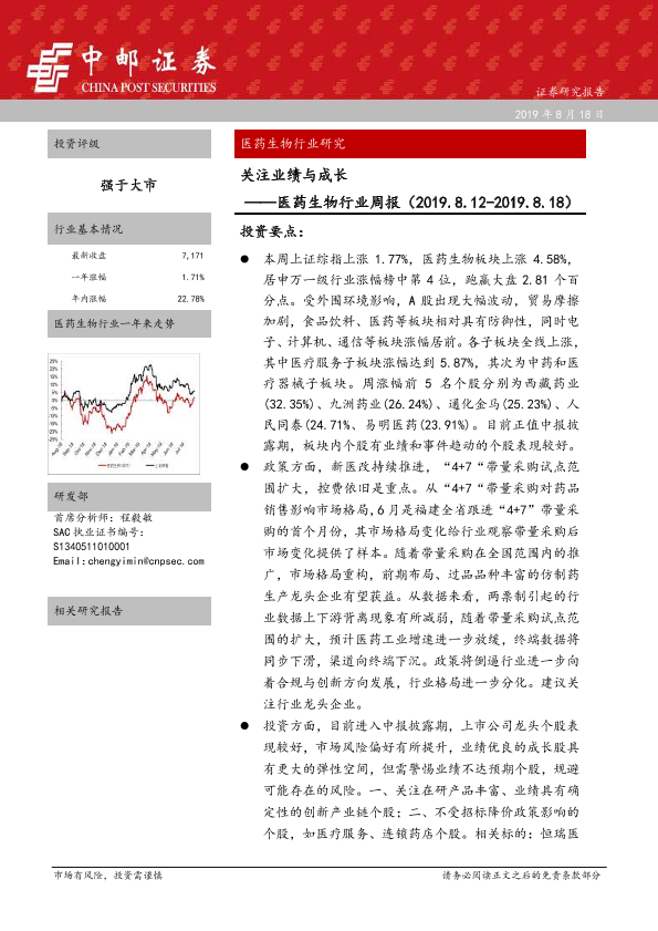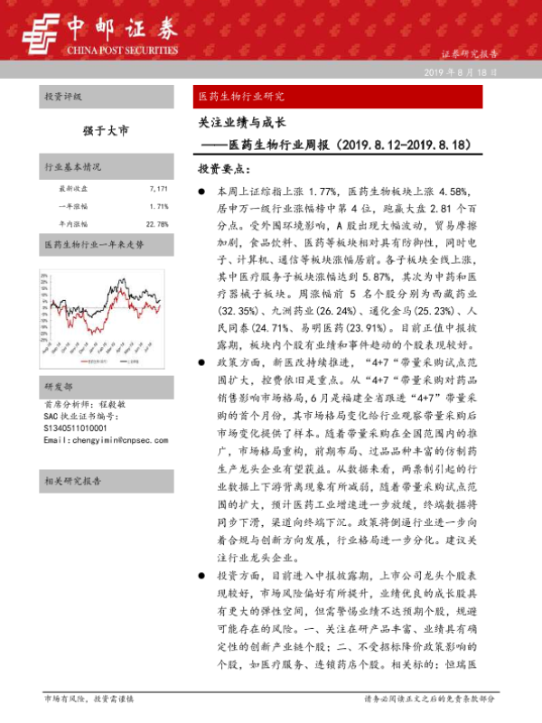 【中邮证券】【20190818】医药生物行业周报:关注业绩与成长-14页