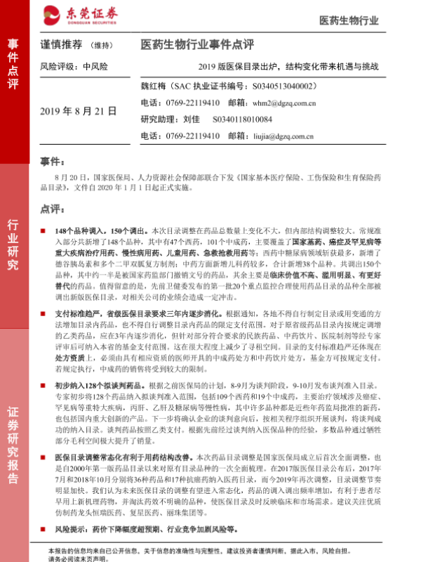 【东莞证券】【20190821】2019版医保目录出炉,结构变化带来机遇与挑战-2页