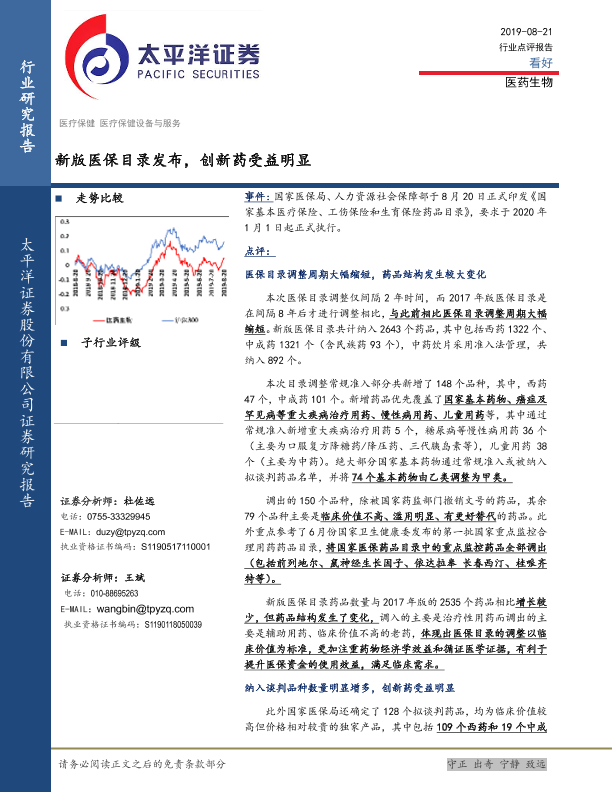 【太平洋证券】【20190821】新版医保目录发布,创新药受益明显-10页
