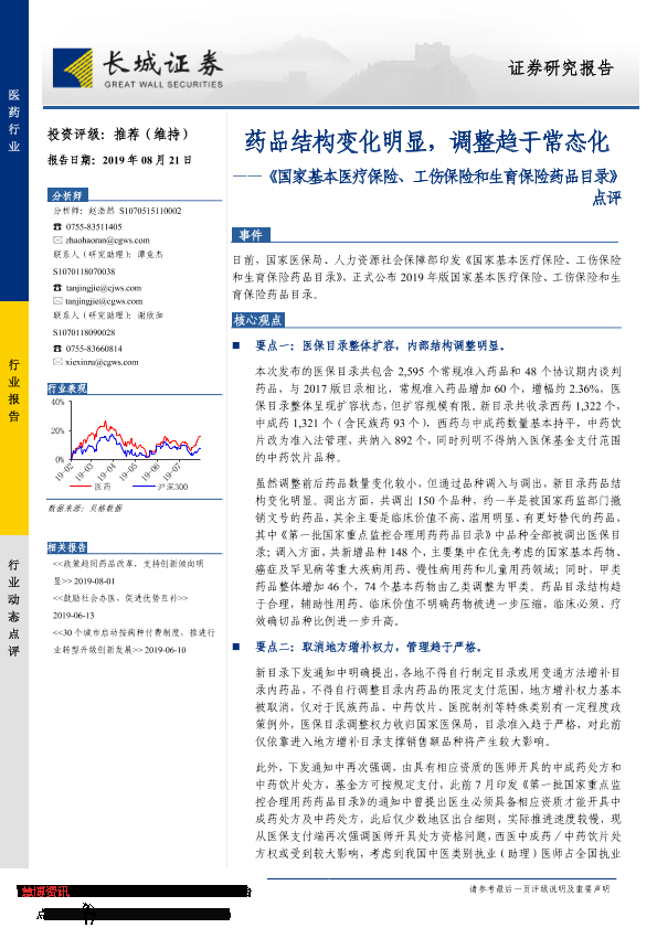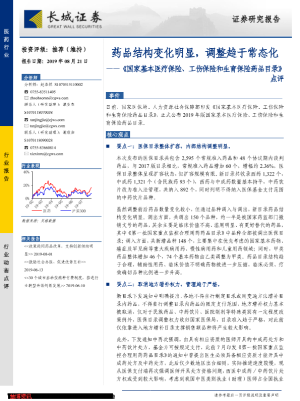 【长城证券】【20190821】国家基本医疗保险、工伤保险和生育保险药品目录点评-3页