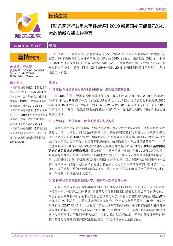 【粤开证券】【20190821】2019新版国家医保目录发布吐故纳新方能去伪存真-5页