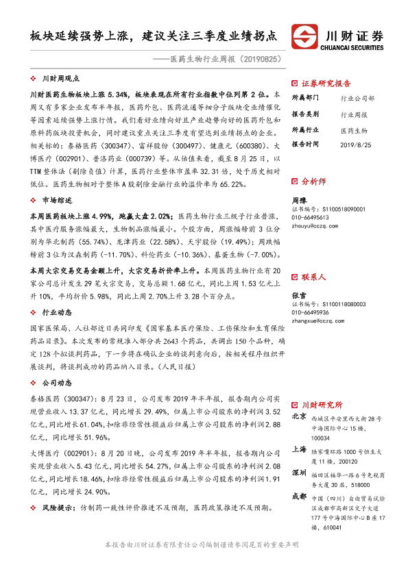 【川财证券】【20190825】医药生物行业周报:板块延续强势上涨,建议关注三季度业绩拐点-14页