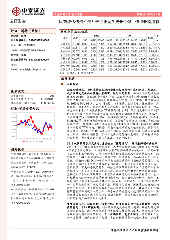 【中泰证券】【20190825】医药生物行业周报:医药股估值贵不贵?子行业龙头成长性强,值得长期拥有-8页