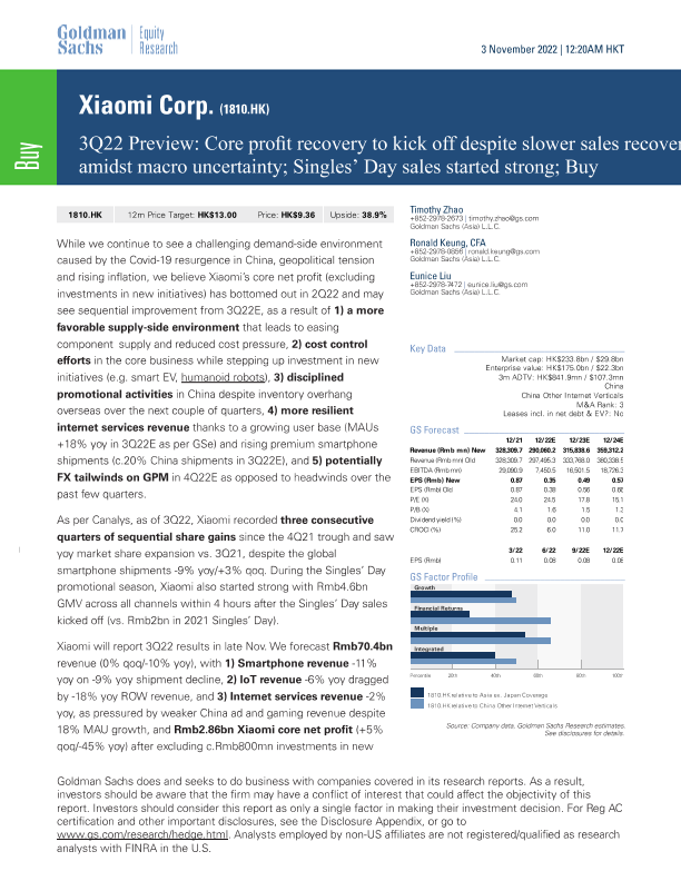 【Goldman Sachs】【20221103】3Q22 Preview Core profit recovery to kick off despite slower sales recovery amidst macro uncertainty; Singles’ Day sales started strong; Buy-13页