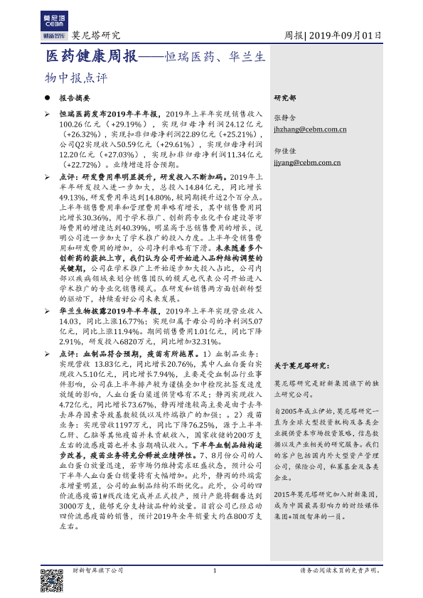 【莫尼塔研究】【20190901】医药健康周报——恒瑞医药、华兰生物中报点评-16页