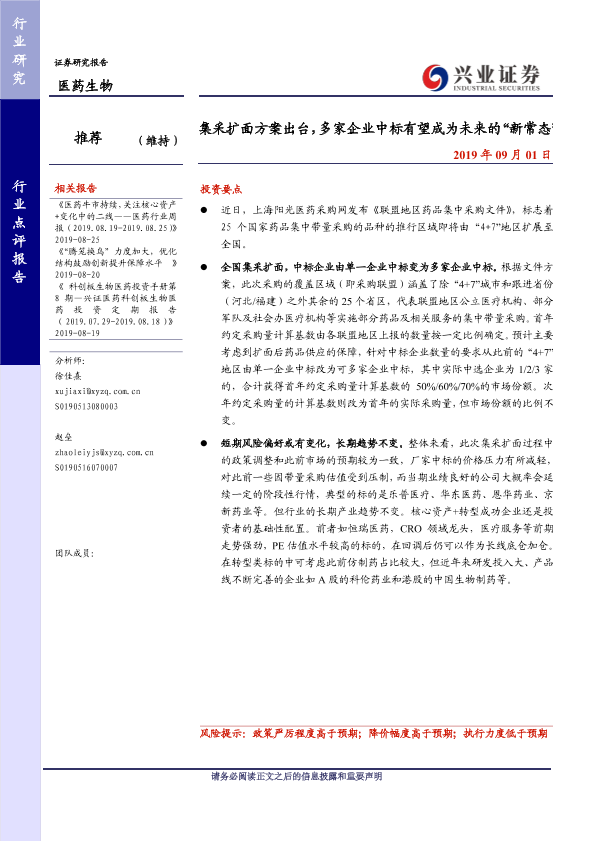 【兴业证券】【20190901】集采扩面方案出台,多家企业中标有望成为未来的“新常态”-4页
