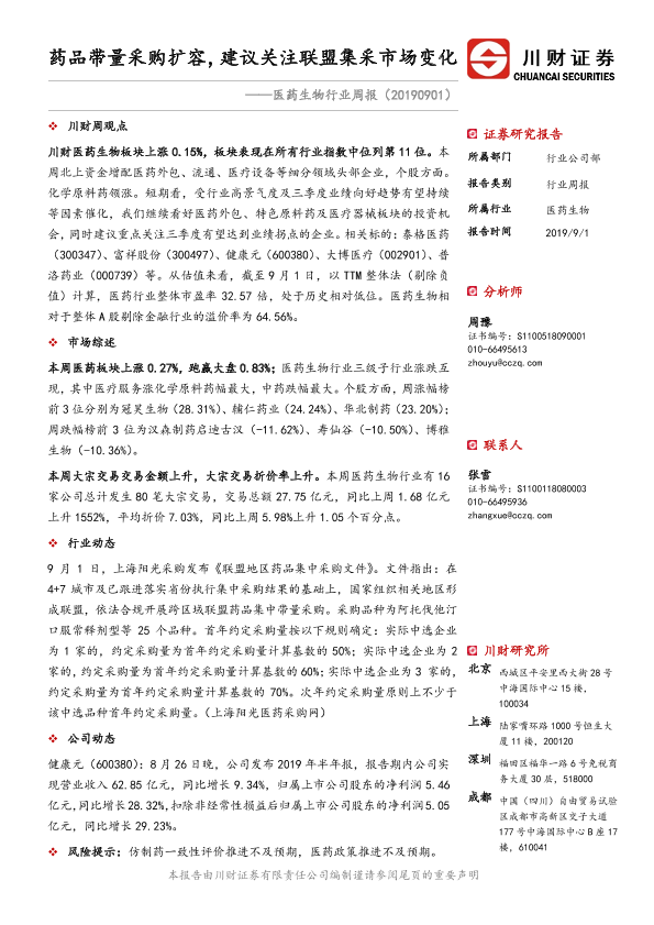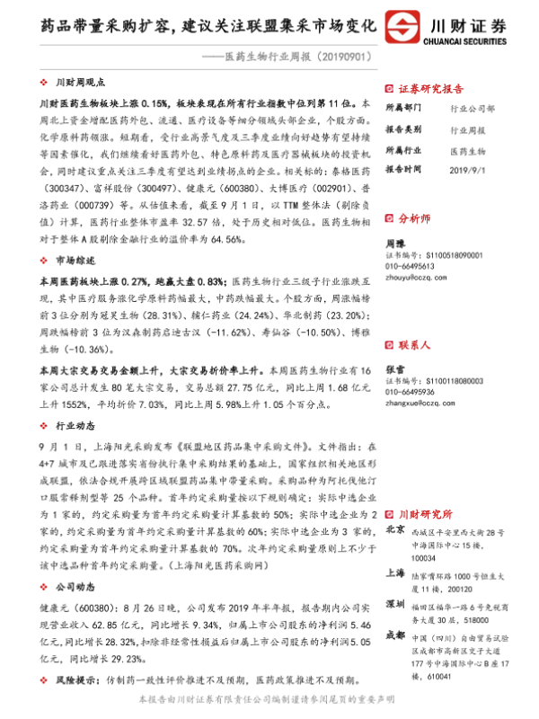 【川财证券】【20190901】医药生物行业周报:药品带量采购扩容,建议关注联盟集采市场变化-14页