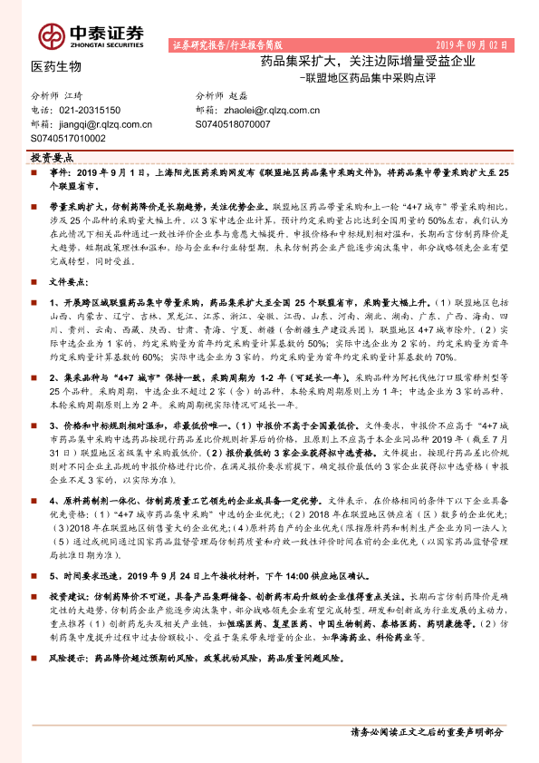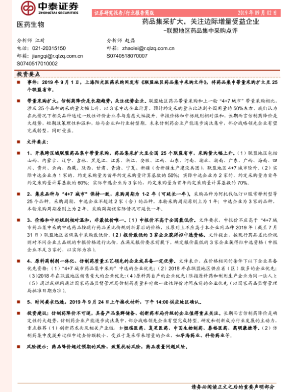 【中泰证券】【20190902】医药生物行业:联盟地区药品集中采购点评-2页