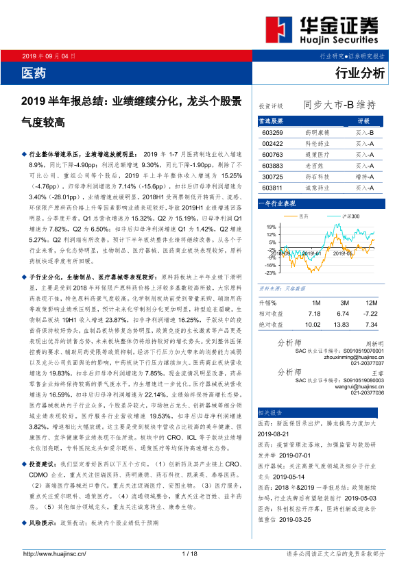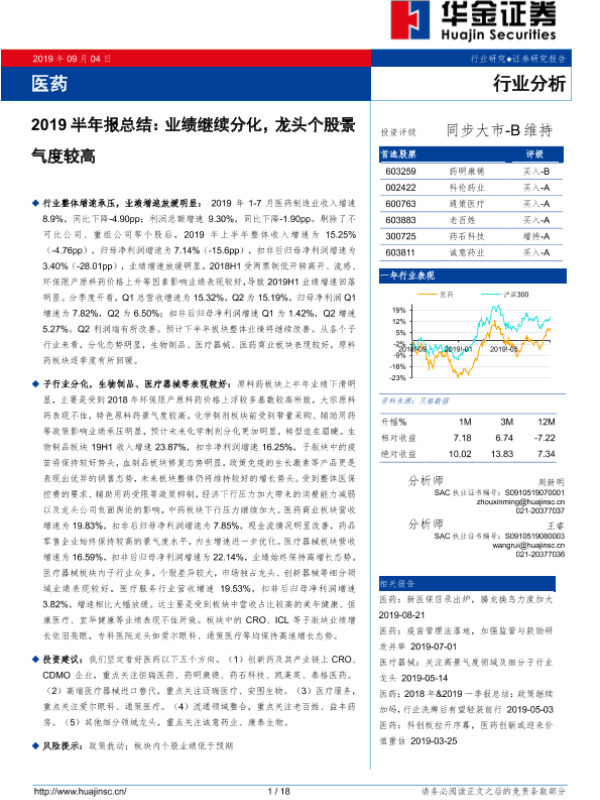 【华金证券】【20190904】医药行业2019半年报总结:业绩继续分化,龙头个股景气度较高-18页